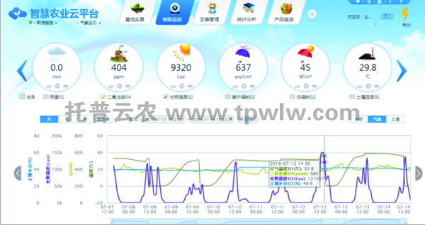 ?????? 2014年上半年,為了加快基地早日實現智能化、規模化、標準化、容器化生產,順應我國園藝生產發展的方向,德清綠色陽光農業生態有限公司開始著手于基地種植與托普物聯網聯姻。物聯網系統嚴格的環境條件與種植條件管控,不僅解決了傳統容器苗生產依靠人工經驗管理而產生的誤差問題,同時還減少了人力成本高、縮短了種苗生長周期。??????? 托普云農物聯網系統采集溫室內空氣溫濕度、土壤水分、土壤溫度、二氧化碳、光照強度等實時環境數據,通過中繼節點傳輸到控制中心,由中心平臺系統將最新監測數據與預先設定適合農作物生長的環境參數作對比,若出現偏差,計算機會自動發送至指令,智能啟動與系統相連的通風機、遮陽、加濕、澆灌等設備進行工作,直到各數據恢復到正常范圍之內。