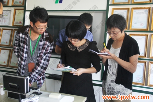 圖為:嘉善縣農經局科教科郁新偉科長(著白色衣服)與眾人一起討論儀器相關知識