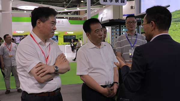 全國農業技術推廣服務中心主任魏啟文(左二)、園藝處處長周澤宇(左一)、副處長冷楊(右一)參觀托普云農展位