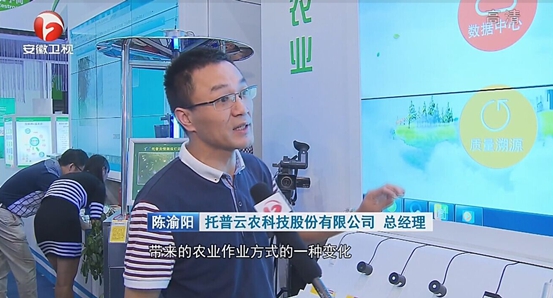9月12日上午,2015中國安徽(合肥)農業產業化交易會在合肥濱湖國際會展中心隆重舉行。浙江托普云農科技股份有限公司(以下簡稱“托普云農”)應邀參加。安徽衛視記者采訪了陳渝陽總經理,并在安徽新聞聯播對托普云農進行了報道。